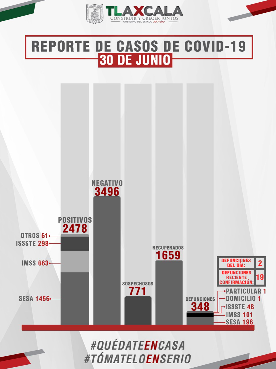 De acuerdo con el reporte de este miércoles, la Secretaría de Salud del Estado (Sesa) confirmó 64 casos positivos más y 2 fallecimientos de Covid-19 en Tlaxcala registrados en hospitales de la Sesa; además, en el acumulado de lamentables fallecimientos se suman 19 casos que fueron confirmados con posterioridad, de los cuales 10 se reportaron en el IMSS, 8 en la Sesa y uno en el ISSSTE.