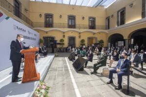 En el patio central del Palacio de Gobierno, Marco Mena destacó el esfuerzo y compromiso de directivos, docentes, personal administrativo y de apoyo del CECyTE Tlaxcala, quienes con su dedicación ofrecen a 14 mil jóvenes estudiantes de diferentes municipios la opción de vincular su formación con el mundo laboral a través del Modelo Mexicano de Educación Dual.