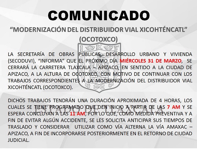 Tlaxcala, Tlax., 30 de marzo de 2021.- La Secretaría de Obras Públicas, Desarrollo Urbano y Vivienda (Secoduvi) informó que el miércoles 31 de marzo se cerrará la carretera Tlaxcala-Apizaco, en sentido hacia Apizaco a la altura de Ocotoxco, para continuar con los trabajos correspondientes a la modernización del Distribuidor Carretero Xicohténcatl.