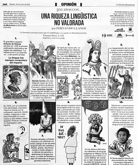 Por ejemplo, el 13 de agosto, en el Centro Cultural Clavijero, ubicado en Morelia, Michoacán, explica Llanos, se instalará en los pasillos, una serie de historietas impresas en gran formato. Se trata de historietas que invitan a la reflexión, en el marco de los 500 años de la caída de Tenochtitlan, sobre problemas que tienen cinco siglos y que se derivan del encuentro y choque de dos mundos. Son imágenes que el artista ha realizado este año y que ha publicado en el diario La Voz de Michoacán.