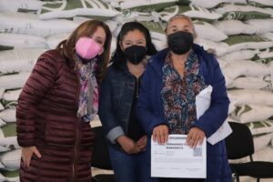 De manera simbólica, Verónica Cabrera Zempoaltecatl, Laura Medel Flores, Margarita Romano Bautista y Margarita Fernández Flores recibieron de Cuéllar Cisneros los vales para intercambiarlos por el fertilizante.