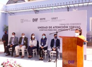 Para ello, la presidenta honorífica del SEDIF, el titular de la SEPE y la directora general del DIF, firmaron un convenio de colaboración para garantizar la atención visual con personal especializado y la dotación de lentes graduados. Con estas acciones se busca la mejora de la agudeza visual de las y los estudiantes, optimizar su rendimiento escolar y evitar la deserción en las escuelas.