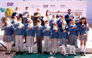 En la firma del convenio, que se llevó a cabo en el patio principal del DIF Estatal, estuvieron como testigos de honor las y los alumnos de la escuela primaria Lázaro Cárdenas de la comunidad de San Rafael Tepatlaxco del municipio de Chiautempan.