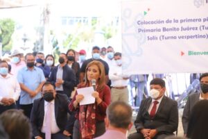 Tlaxcala, Tlax., 9 de mayo de 2022.- La gobernadora Lorena Cuéllar Cisneros colocó la primera piedra para la construcción de la Escuela Primaria “Benito Juárez” y “Benjamín González Solís”, es sus turnos matutino y vespertino, respectivamente, de la comunidad de Aquiahuac del municipio de Tetlatlahuca, cuyos trabajos comenzarán con la edificación de la barda de contención.