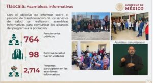 De igual forma, el funcionario federal dio a conocer que en la estrategia para informar a la población sobre los cambios en los servicios 764 servidores públicos del IMSS, de la Secretaría de Salud del Estado (Sesa), servidores de la nación, funcionarios del gobierno estatal y autoridades municipales conformados en 10 equipos, han realizado asambleas informativas en más de 100 centros de salud.