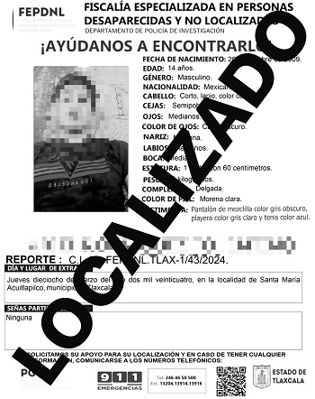 Tras recibir la denuncia correspondiente por familiares del adolescente y el hombre en la que señalaban que fueron vistos por última vez en la comunidad de Acuitlapilco, del municipio de Tlaxcala, Policía de Investigación llevó a cabo las diligencias correspondientes; sin embargo, el menor y el masculino se presentaron en las instalaciones de la Fiscalía, a fin de dar de baja su ficha de búsqueda.