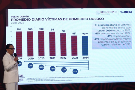 Sin embargo, destacó que en el caso de Guanajuato, entre septiembre de 2024 y febrero de este año registró una tendencia al alza de 34.8 por ciento en asesinatos, que llegó a alcanzar 12.7 al día. A partir de entonces se mantiene un consistente descenso de 55.6 por ciento, hasta llegar en la actualidad a 5.65 homicidios cotidianos.