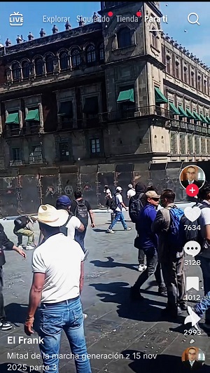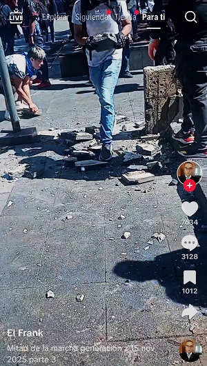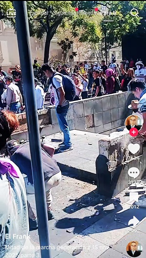 En videos que circulan en las redes sociales TikTok y X, los que nunca se verán en las pantallas del duopolio de las televisoras comerciales (Tv Azteca-Televisa), entre otras, se puede observar cómo grupos de personas armadas con herramientas utilizadas en la construcción como barretas, mazos, martillos, pinzas, cizallas, tubos, cadenas y equipos portátiles para soldar-desoldar, durante la marcha y antes de la llegada de los contingentes a la plancha del Zócalo capitalino, ya estaban demoliendo jardineras y otros elementos del mobiliario urbano, cuyos pedazos de ladrillo y concreto eran lanzados por hombres y mujeres, incluidos adultos mayores, en contra de los policías que aún se encontraban resguardados detrás de las vallas metálicas. Otros pedazos de materiales pétreos aventados por la turba causaban destrozos al emblemático inmueble del Palacio Nacional.